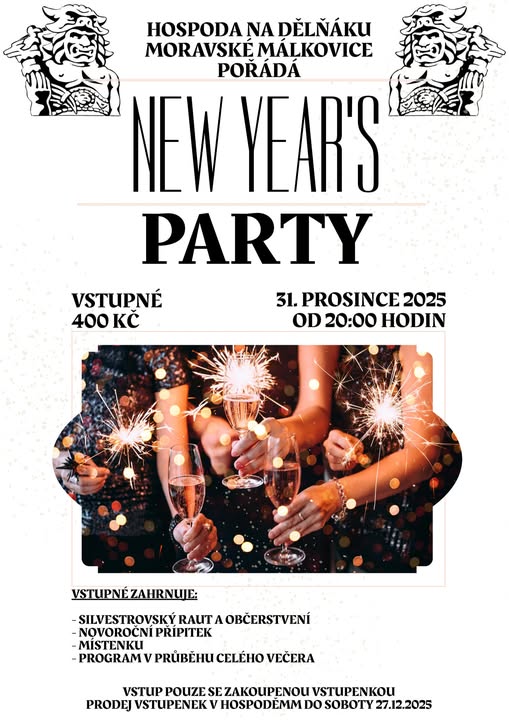 Hospoda na Dělňáku Moravské Málkovice pořádá 31. 12. 2025 oslavu Silvestra a Nového roku. V ceně vstupného 400,- Kč je zahrnutý bohatý raut, novoroční přípitek a zábava po celý večer. Vstupné pouze z předprodeje na baru Hospody MM do soboty 27. 12. 2025. Těšíme se na Vás.